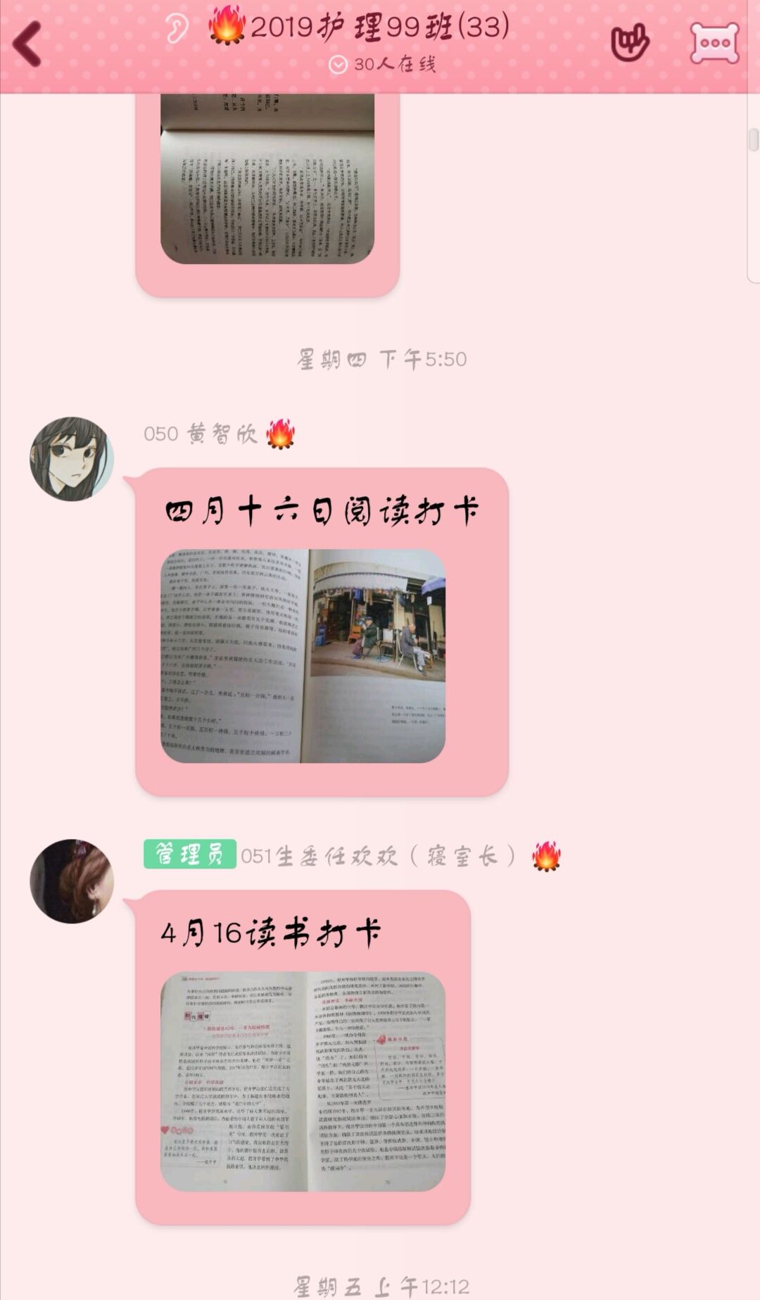 为迎接第25个“世界读书日”的到来,香香腐宅 2019级99班团支部的同学们在班级群里开展了“以书香助力战“疫”,用阅读通达未来”的线上读书打卡活动,所有同学都坚持1月有余。